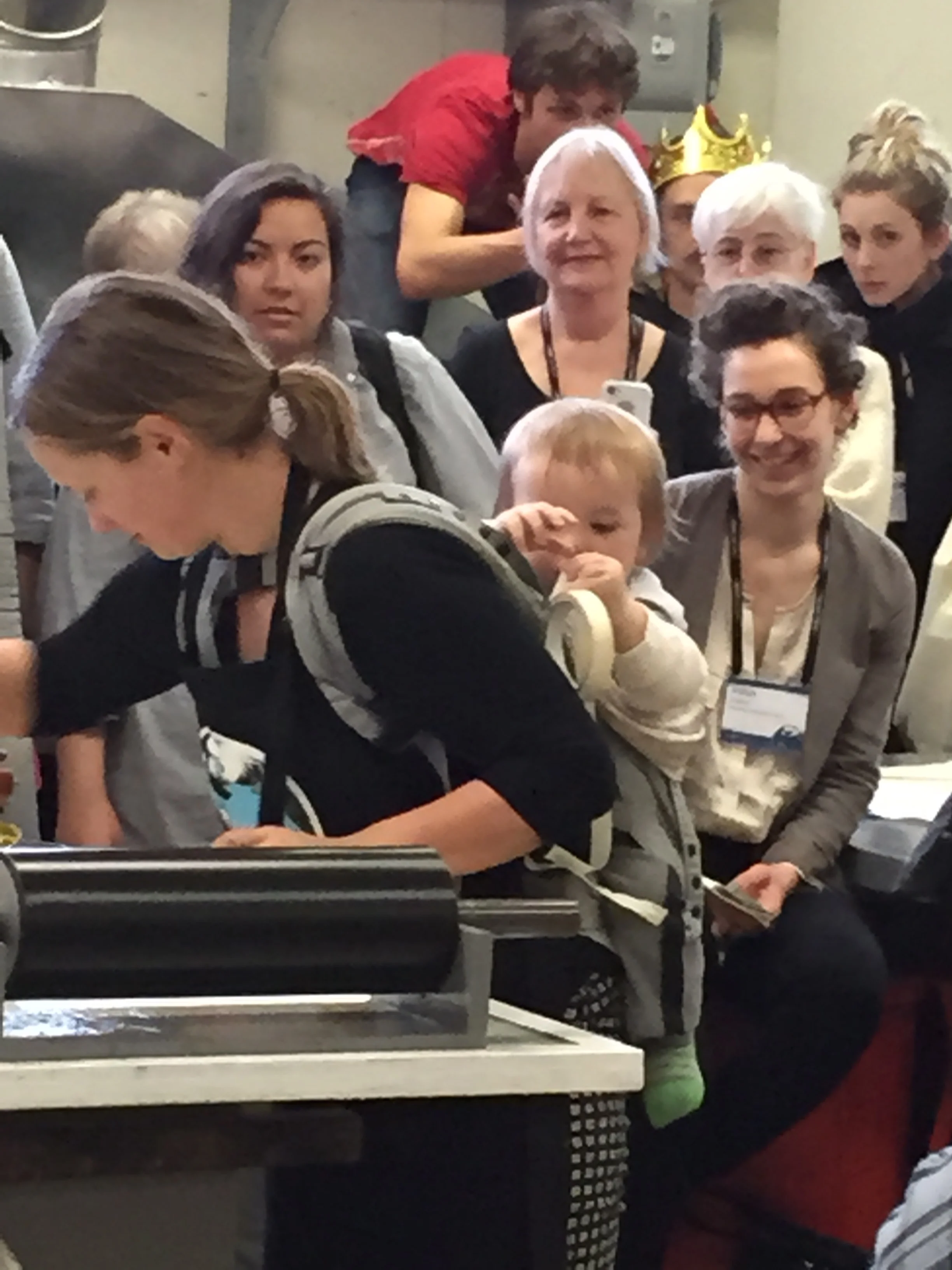 Last night I came back home from three full days saturated by creativity at the Southern Graphics Council International Conference. Despite being inspired, overwhelmed and satiated by the immense variety of creativity around me, one episode seems to linger in my mind.... The conference organizes demonstrations of certain techniques so printmakers can expand their repertoire and one such demo was given by the artist Monika Meler- A young mother with two little children. For a good part of the demonstration, she had her younger son - a few months old, strapped to her back in a carrier. She moved gracefully and comfortably between mixing and rolling out ink with a good sized roller, inking her surfaces and cranking the press to make her beautiful diffused relief prints. At one point, her son reached out and grabbed the roll of tape and started unravelling it. This kept him busy for a while and finally started crying about an hour into the demo... The crowd cheered as Monika handed him off to a friend so she can complete what she started.